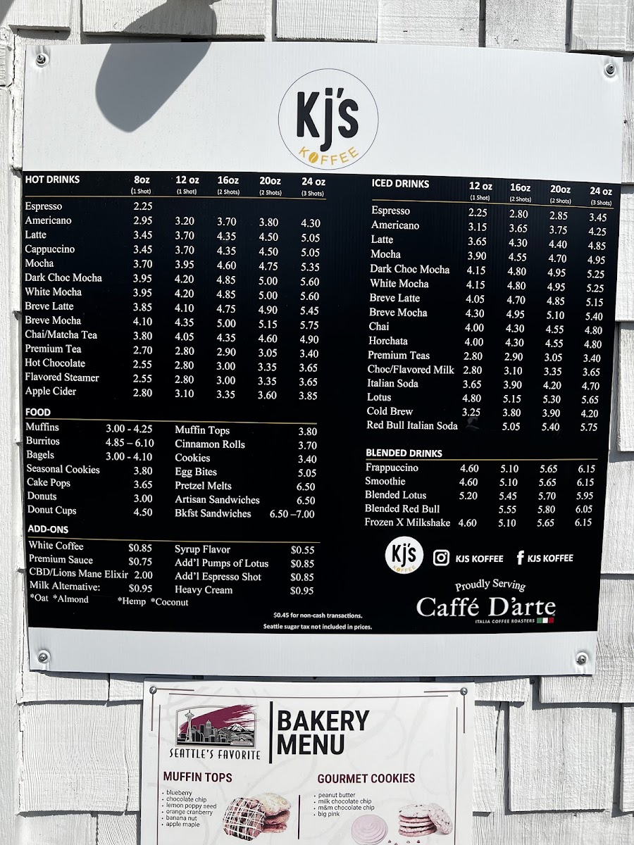 Kj's Koffee, located at 12303 15th Ave NE in Seattle, WA, is a cozy and inviting coffee shop that quickly becomes a favorite for locals and visitors alike. Known for its welcoming staff and high-quality beverages, this spot offers a delightful experience whether you're stopping by for a quick pick-me-up or enjoying a leisurely break. The drinks here stand out for their rich flavors, avoiding the cheap, syrupy taste often found at other coffee stands. Whether you're a fan of classic espresso drinks, matcha, or something more adventurous, Kj's Koffee has something to satisfy every craving.